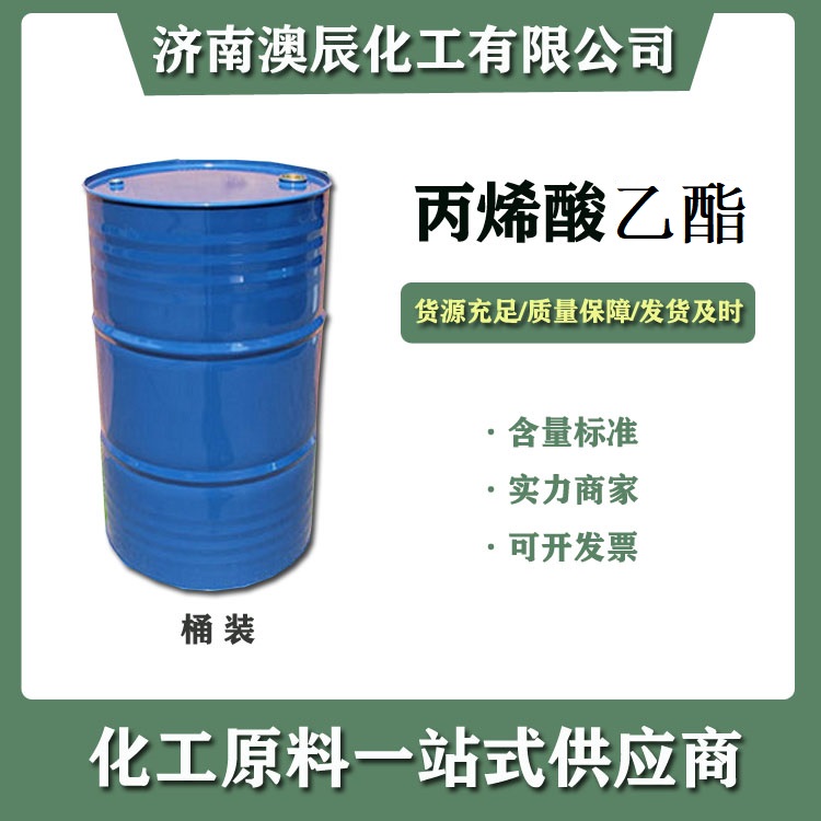 济南澳辰化工有限公司主营浙江卫星99.5%优级丙烯酸乙酯,各种丙烯酸酯类,1桶起订,货源稳定,品质可靠,济南常年有货,济南常备库存30吨,180公斤/桶现货供应。欢迎采购,量大从优丙烯酸乙酯