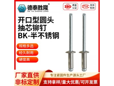 · 开口型(扁圆头):铆体中部有开口,使用最广。特点是铆接后铆体顶部留有明显的开口,便于观察锁圈位置。
